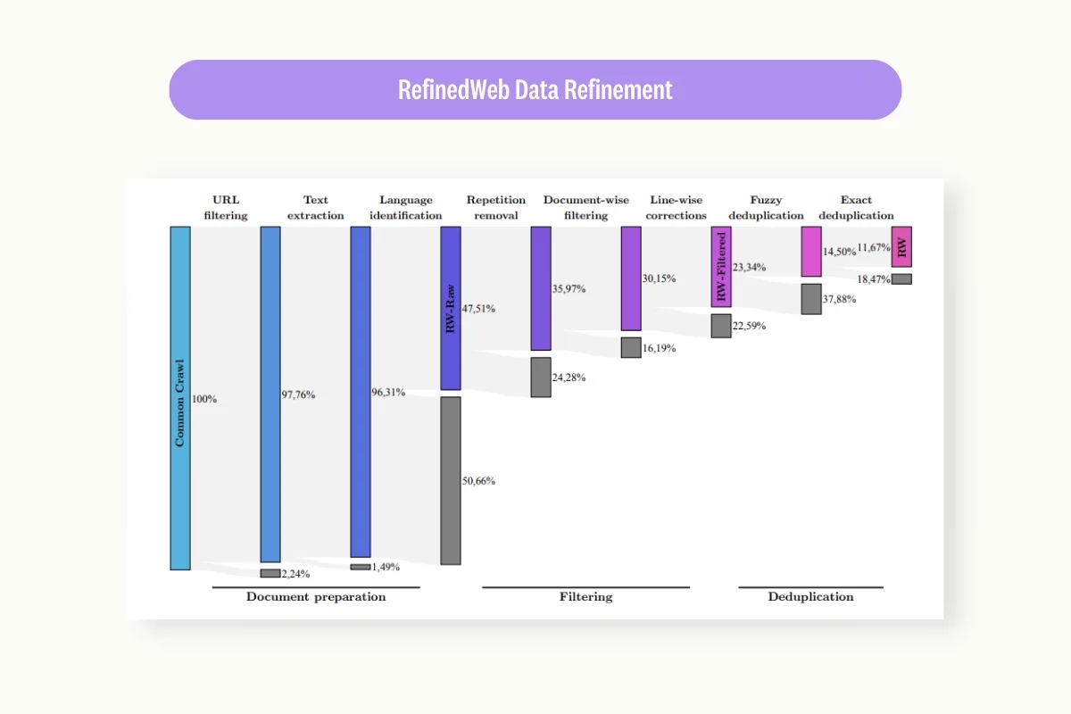 RefinedWeb is a massive corpus of deduplicated and filtered tokens from the Common Crawl dataset. In natural language processing (NLP), a token is a unit of text that is meaningful to the language being processed. Tokens can be words, punctuation marks, or other symbols. The dataset has more than 5 trillion tokens of textual data, of which 600 billion are made publicly available. It was developed as an initiative to train the Falcon-40B model with smaller-sized but high-quality datasets.