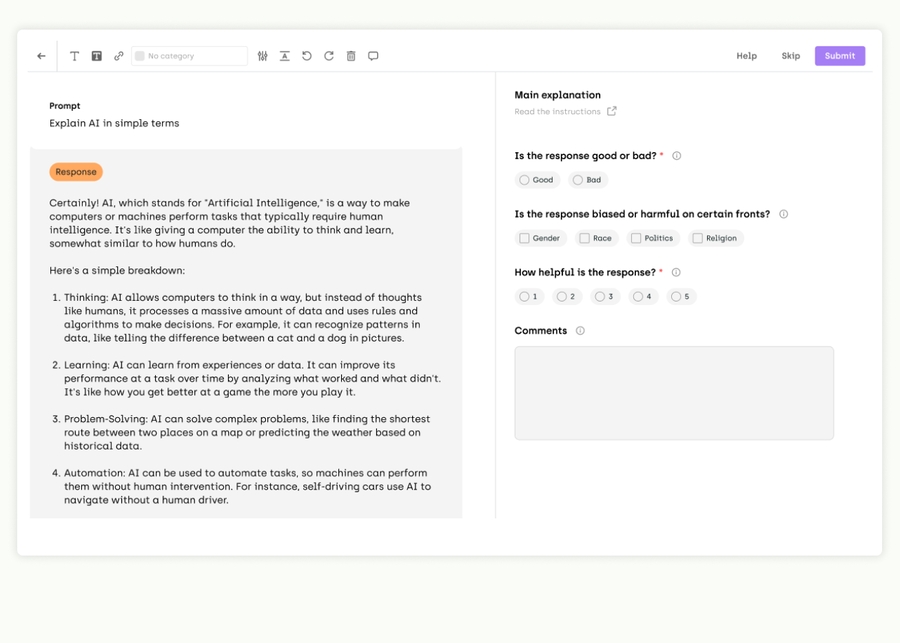 The best LLM for your team is one fine-tuned with your data. Our platform empowers start-ups and enterprises to craft the highest-quality fine-tuning data to feed their LLMs. See for yourself.