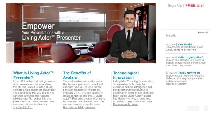 Living Actor™ is another option for creating talking avatar animations. This software has a lot of 3D characters that differ according to style, age bracket, and culture as well as backgrounds. When your talking avatar is done animated, the avatar can be downloaded as a video file format. You can use that downloaded video then for different purposes such as lecture videos, emails, virtual training, and other presentations.